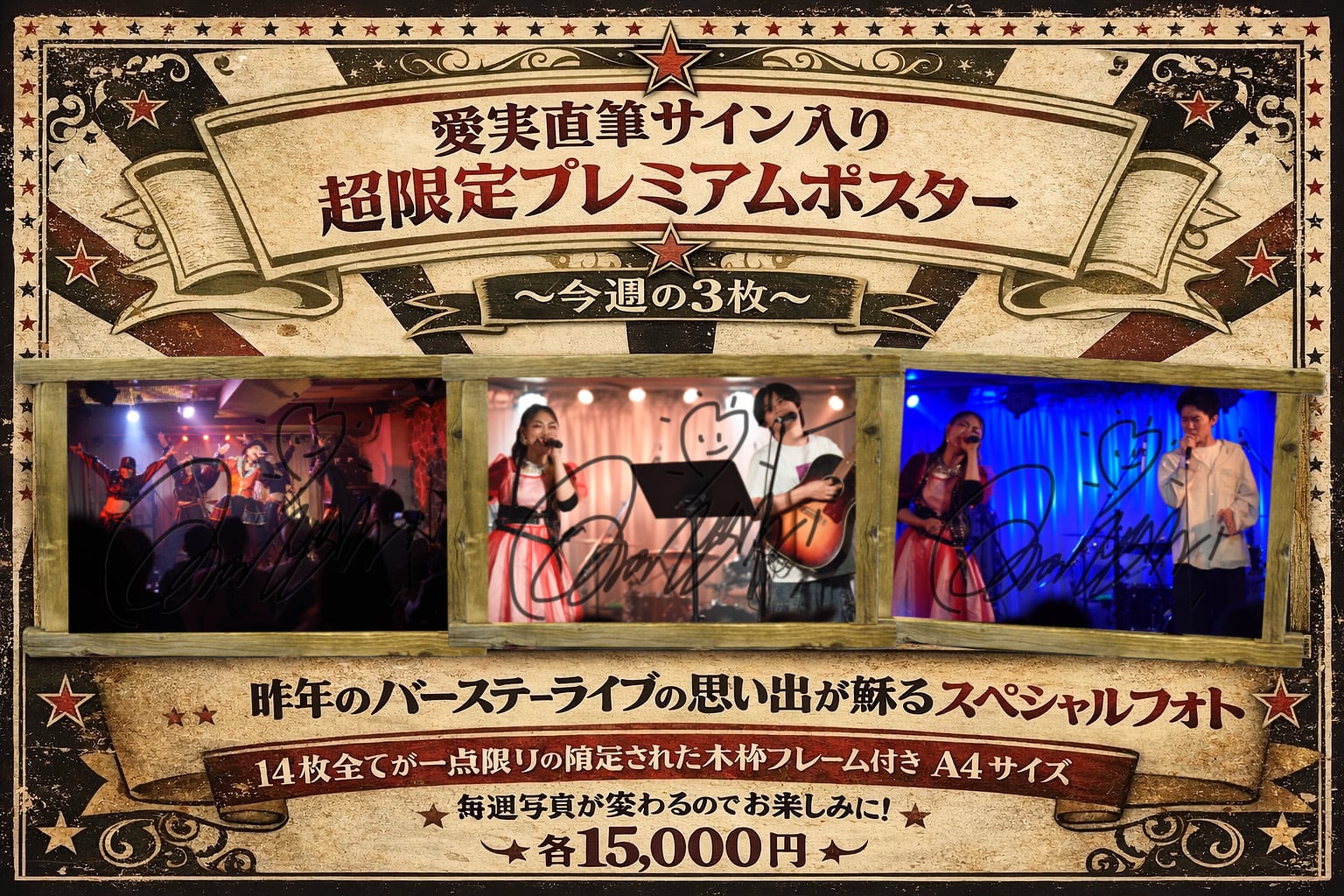超限定プレミアムポスターB✨ 昨年のバースデーライブの感動を再び感じられる、愛実直筆サイン入りのスペシャルアイテムです!全14種それぞれが一点限りの限定品で、実際にライブで使用された木枠付きです。この特別なポスターは、思い出の瞬間を鮮やかに再現しており、ファン必見のコレクションです❣️ お手元に届く記念品として、自分だけの特別な一枚をお楽しみください! また、週に3枚ずつのの販売で、14枚完売で重大発表あり!! 3枚売れなければその時点で販売終了します(TᴖT ⚠︎見本はサインが大きく入っていますが、あくまでサンプルなので、実際は左下に入るイメージです。 ⚠︎︎ 購入はお早めに!すぐに完売する可能性があります。